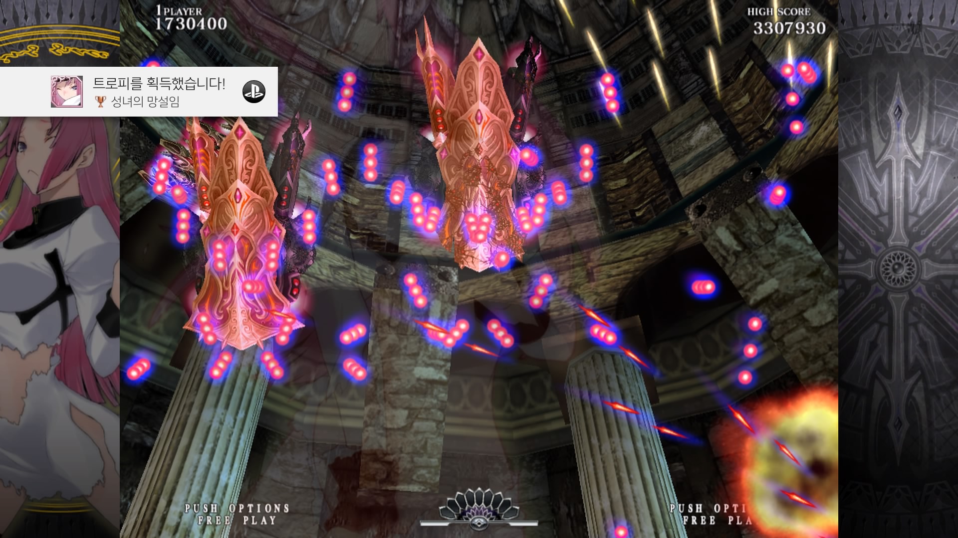 PS4/PS5로 플레이했을 때 프레임 드랍(화면 끊김 현상)은 거의 느껴지지 않았어요. 수많은 탄막이 쏟아지는데도 부드럽게 움직이니까 "아, 내가 못 피해서 죽었구나" 하고 납득이 가더라구요. 로딩 속도도 빨라서 죽어도 바로 "한 판 더!"를 외치게 됩니다.