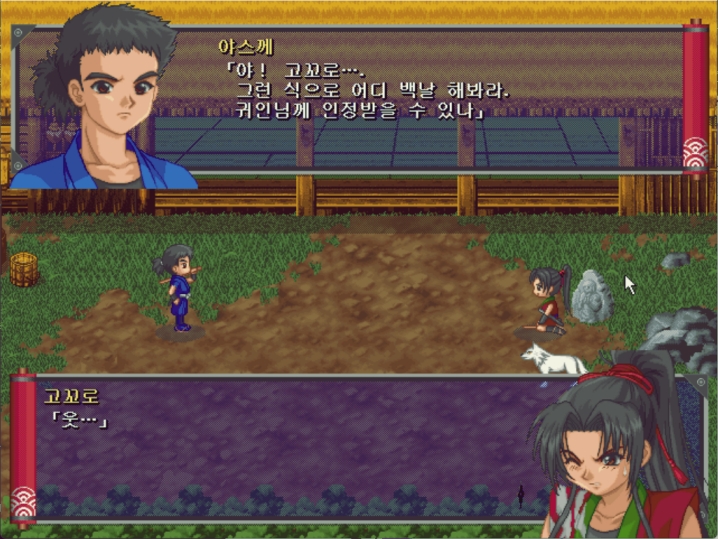 <파랜드 택틱스>로 유명한 TGL이 작정하고 만들었던 바로 그 게임! 귀여운 그림체에 속아 들어왔다가, 의외로 진지한 대체 역사 스토리와 엄청난 인카운터율(?)에 고통받았던... <미소녀 닌자 모험기 1: 하늘을 가르는 검>입니다.